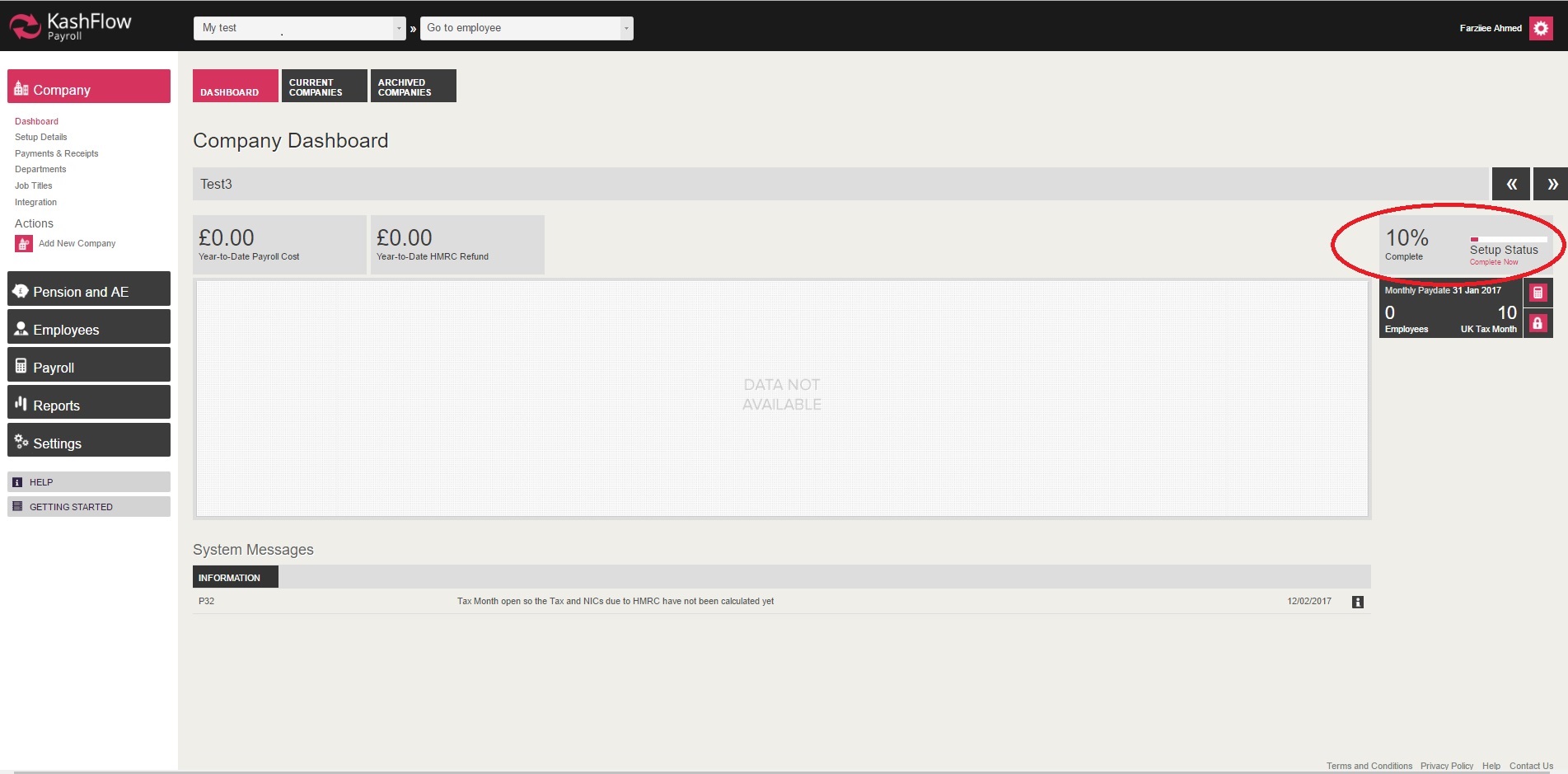 If a new company record has been inserted and the setup is not complete, then you can given the option to 'Complete Now'.