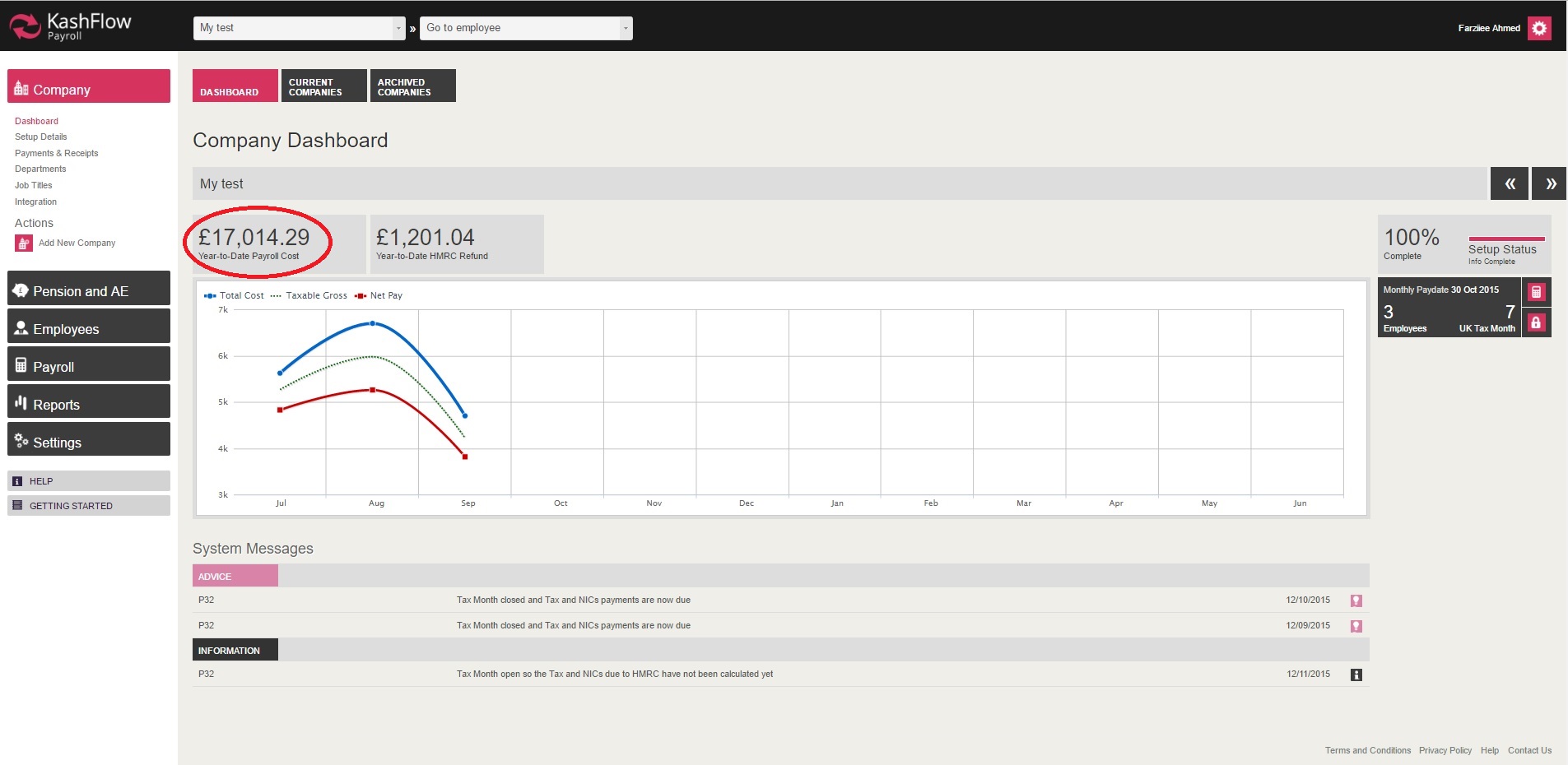 This area of the dashboard provides you with a graph of the company costings based on the payslip amounts processed.
