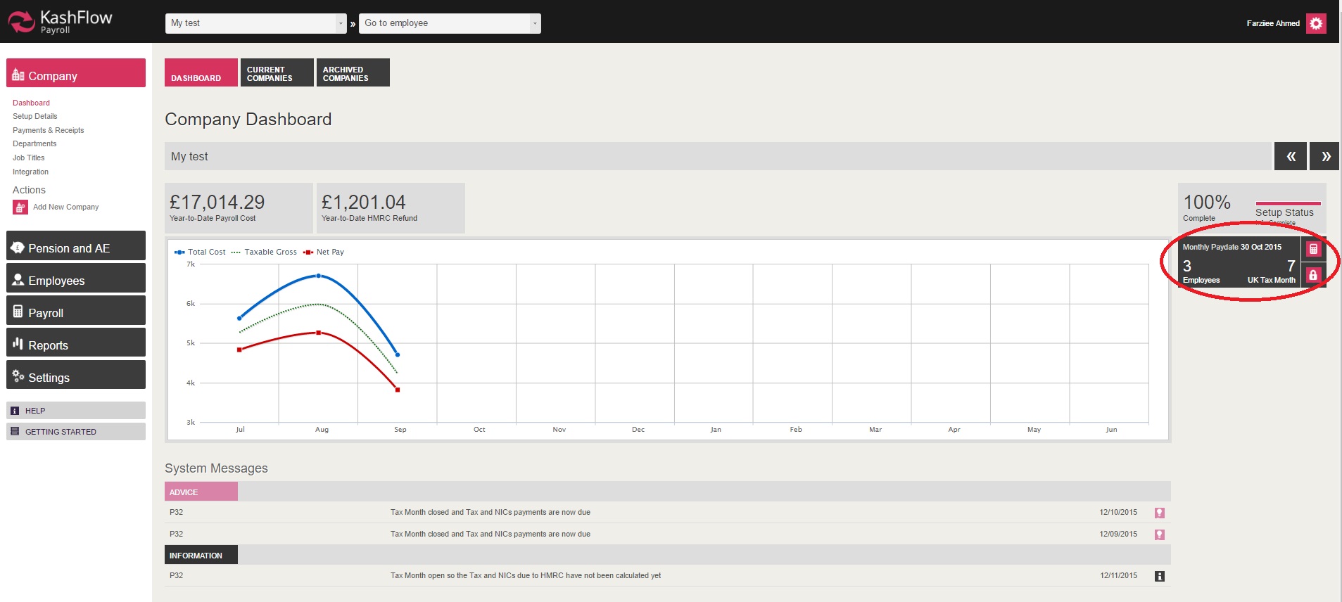 The system message area is used to inform the Payroll administrator that tax period has been completed and the PAYE payment report is now ready for user to use and make payment to HMRC.