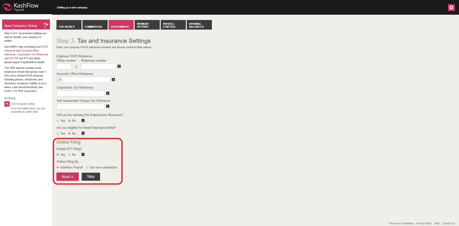 In the 'Government' section, you will be asked to enter in the Employer PAYE Reference and to indicate information about RTI submission.