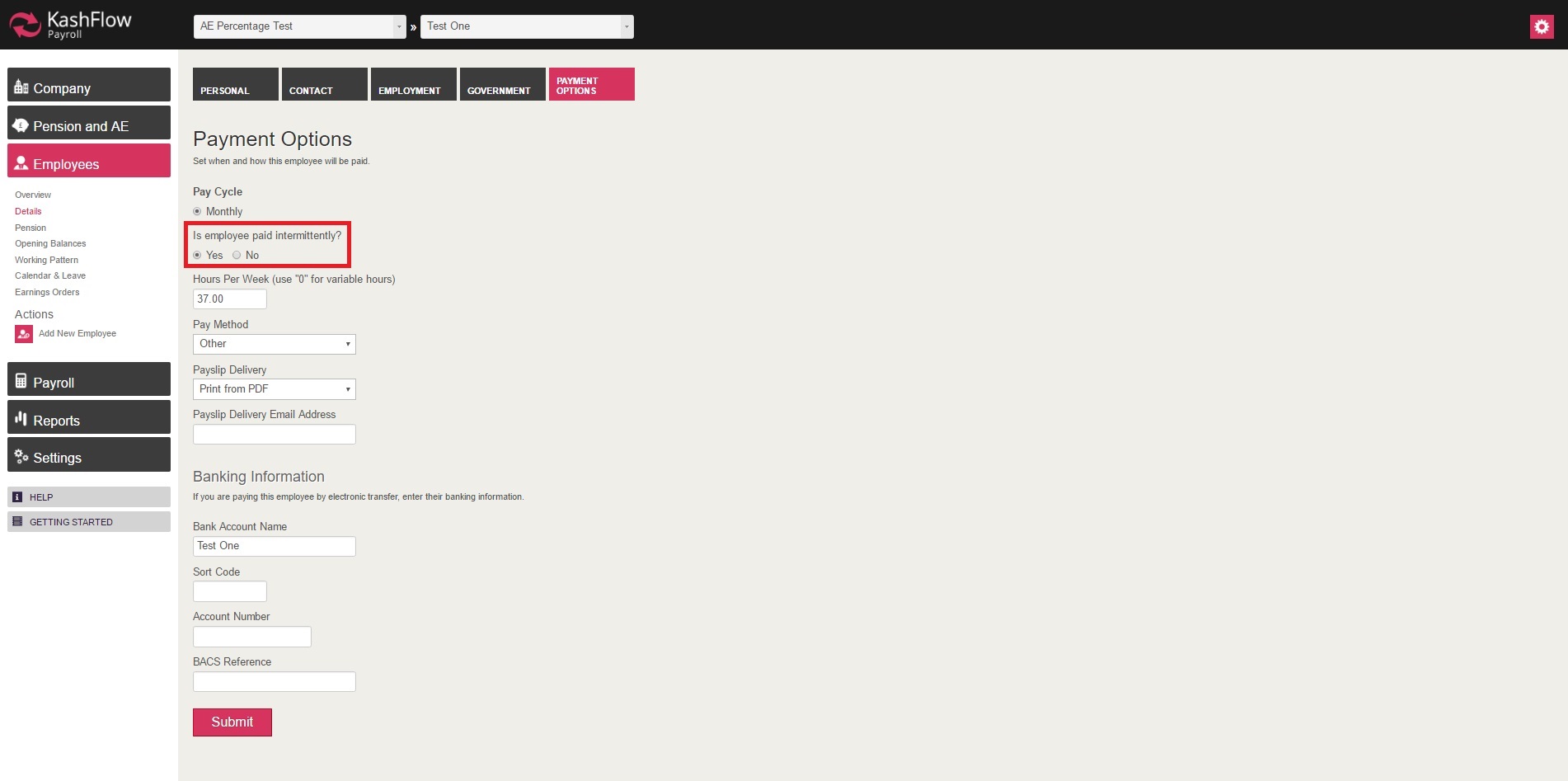 To set an employee as 'Intermittent', you will need to go to: Employee > Details > Payment Option > select 'Yes' for 'Is employee paid intermittently?' and then click 'Submit' for the changes to be applied